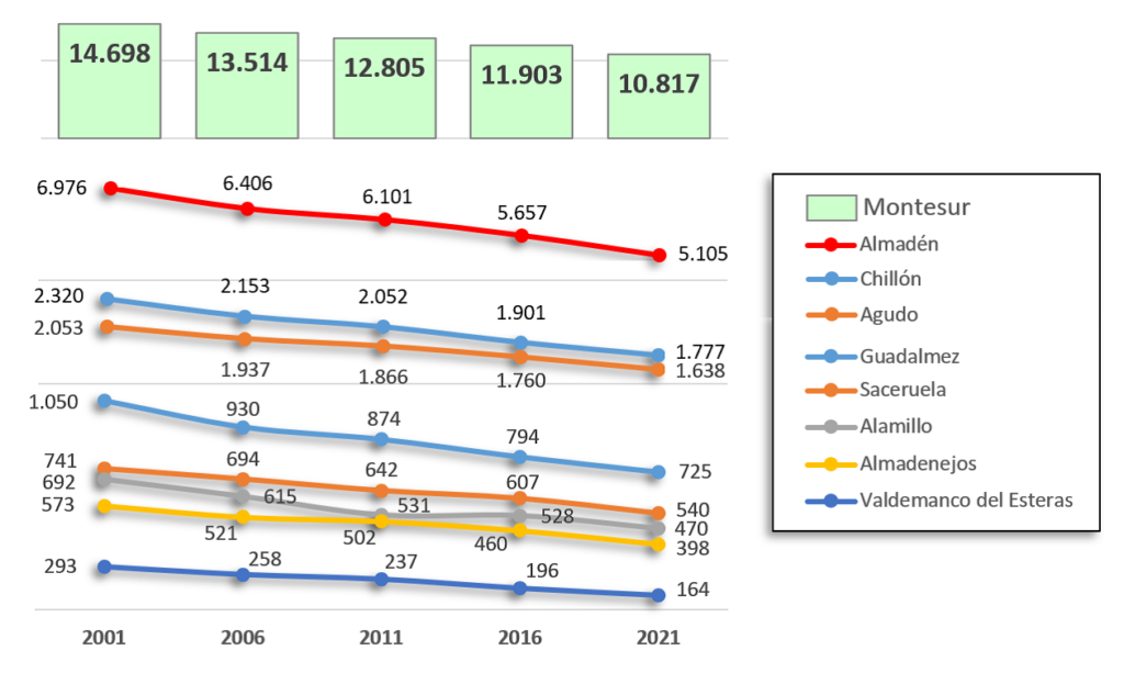Su evolución demográfica ha dejado un saldo negativo del -26% para el conjunto de la Comarca, que en el caso de Almadén se eleva al -27%, se atenúa ligeramente en el conjunto de los municipios de Chillón y Agudo hasta el 21%, en tanto que en los cinco pequeños municipios restantes se incrementa hasta el 31%. Se trata de una pérdida de población derivada del significativo nivel de envejecimiento de buena parte de estos municipios, la caída generalizada de la natalidad por un escenario económico global de incertidumbre, así como también de unas condiciones laborales no siempre favorables para la población joven en edad de formar familias y la escasa capacidad de atraer población inmigrante estarían en la base de esta pérdida de población.