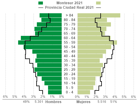 La estructura de edades que se desprende de la pirámide de población permite establecer datos como un índice de dependencia por el que se relaciona la población potencialmente inactiva, respecto de la activa y que para el conjunto de Montesur resulta 65,3 lo que supone un valor significativamente por encima del 51,7 de la media provincial o del 50,7 que corresponde tanto a Castilla-La Mancha.